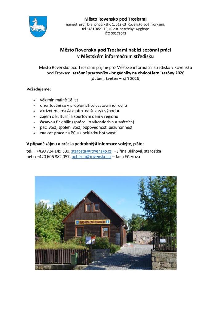 Město Rovensko pod Troskami přijme pro Městské informační středisko sezónní pracovníky - brigádníky na období letní sezóny 2026.