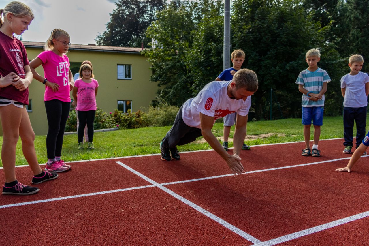 Sportovci vždy předvedli cviky od nejjednodušších až po velice náročné a přitom do cvičení zapojovali děti z naší školy.