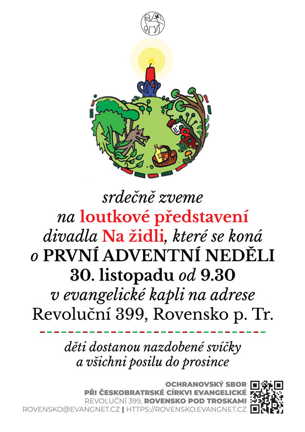 První adventní neděle v Jednotě Bratrské.jpg Typ: JPG obrázek, Velikost: 96.28 kBSrdečně zveme na první adventní neděli do evangelického sboru. Loutkové divadlo Na židli z Turnova sehraje pohádku O červené karkulce. Na chvíli se společně ztišíme před začátkem prosince, na cestě k Vánocům. Posilníme se. A děti si podle zvyku Jednoty bratrské odnesou domů nazdobenou svíčku. Více informací: https://rovensko.evangnet.cz